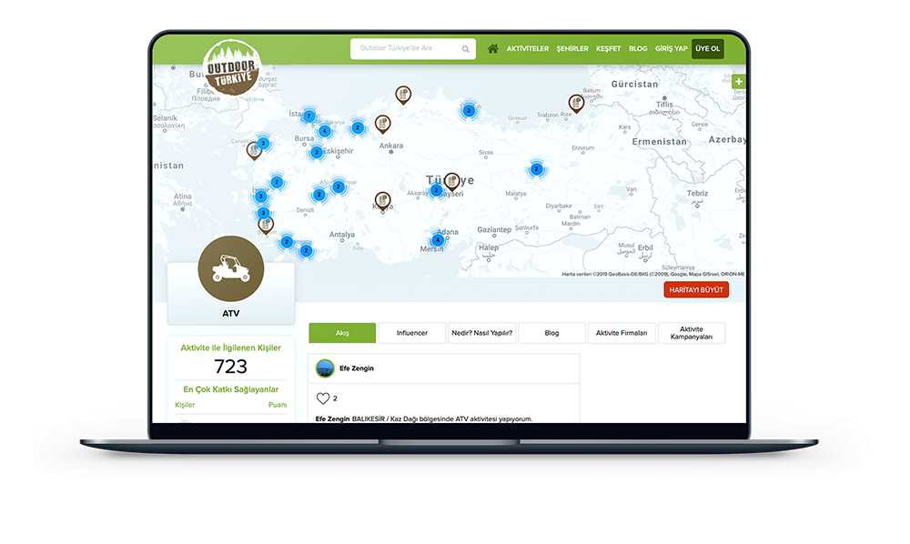 Dünyada benzeri olmayan outdoor platformu Outdoor Türkiye için çok geniş kapsamlı web sitesi tasarladık. Bu web sitesinde kullanıcı paneli ile bireysel üyelikler oluşturuluyor, bu üyelikler fotoğraflar paylaşabiliyorlar, like-dislike yapabiliyorlar, blog yazabiliyorlar, yer ve firma tavsiye edebiliyorlar, ilgi alanlarındaki outdoor aktivitelerini belirleyebiliyorlar, şehirlerin ve aktivitelerin tüm detaylarından haberdar olabiliyorlar ve bunların sonunda puan toplayıp bu puanları belirli alışverişlerde online harcayabiliyorlar. Ayrıca kurumsal üyeliklerle de outdoor dünyasına hizmet eden aktivite yerleri, aktivite eğitim okulları, konaklamacılar, yeme-içme mekanlarının hepsi de kendilerini bu büyük web sitesinde kaydedip yerlerini pinleyebildikleri gibi firmaları hakkında da yazılar yazıp, foto galeri oluşturup, kampanyalar çıkabilmektedirler.